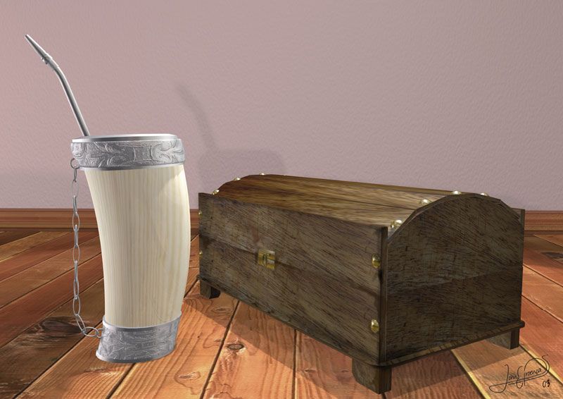 Hola, hace mucho que no pongo nada mío. Esto lo hice en un fin de semana, el objeto que ven como un vaso se llama guampa, que se lo llena con yerba mate, y se sirve con agua helada y mucho hielo, la bebida en sí se llama terere, es una bebida típica del Paraguay, en donde vivo y la caja es en donde se guarda luego la guampa, bueno, sobre el render, es con el Scanline del 3ds Max 5.1, con luces omnis y direccionales, nada de GI ni plugins ni esas cosas, hice apropósito así todo por default para saber si llegaba a algo más o menos bonito, lo que se resultó de este render es que lo puse en mí portfolio en internet y me lo pidieron en tamaño de 8000 * 4000 píxeles para impresión digital y encuadrarla lo vendí por buen precio. Espero que me comenten algo por lo menos. Gracias y saludos.