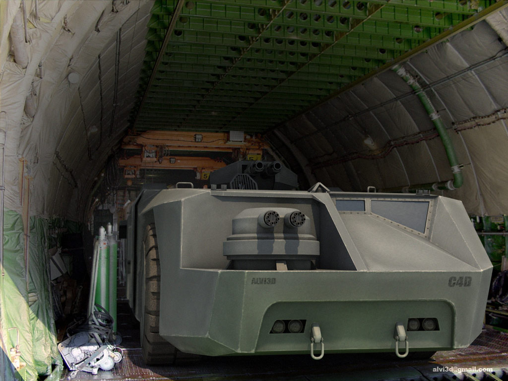 Os dejo un par de imágenes en Studio y una integración en la bodega de un avión de transporte.
