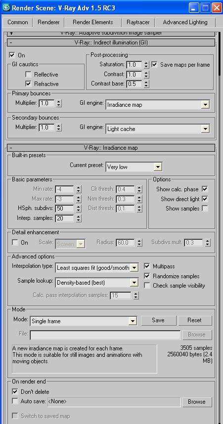 También tienes algunos parámetros de render que pueden hacer que este te vaya más lento, por ejemplo, los samples del randomize Quasi Montecarlo sampler, y también puedes probar a utilizar el Quasi Montecarlo en los rebotes secundarios, ya que light caché hará que en exteriores te vaya un poco más lento, inténtalo y a lo mejor consigues algo más de rapidez y calidad.