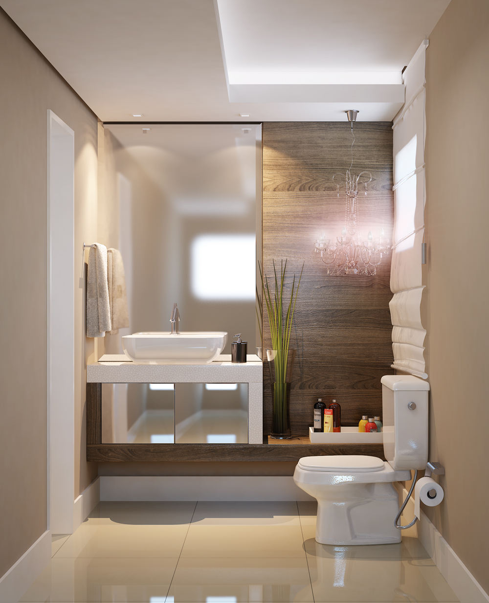 La iluminación me parece correcta. La toalla, el jarrón, los frascos, el lavabo y la madera están de lujo. La lámpara de araña no tiene mucho sentido en esa posición, pero también está muy bien.