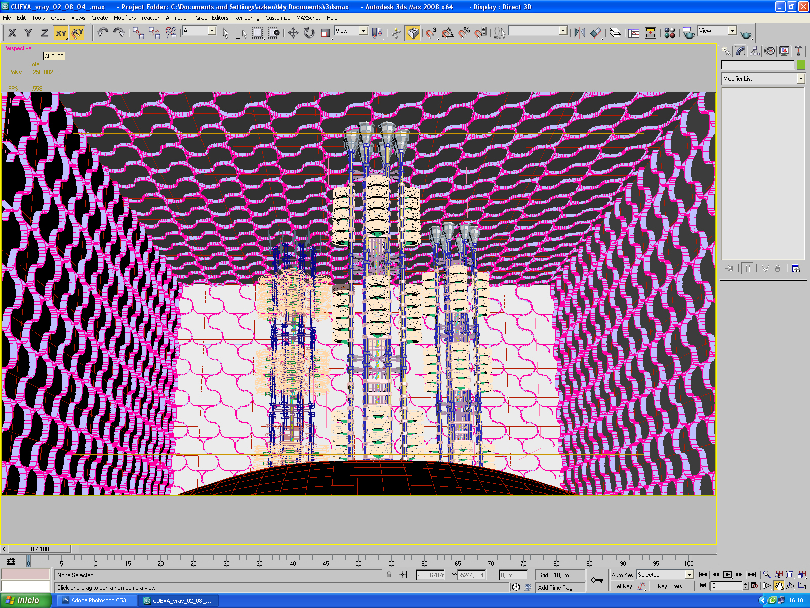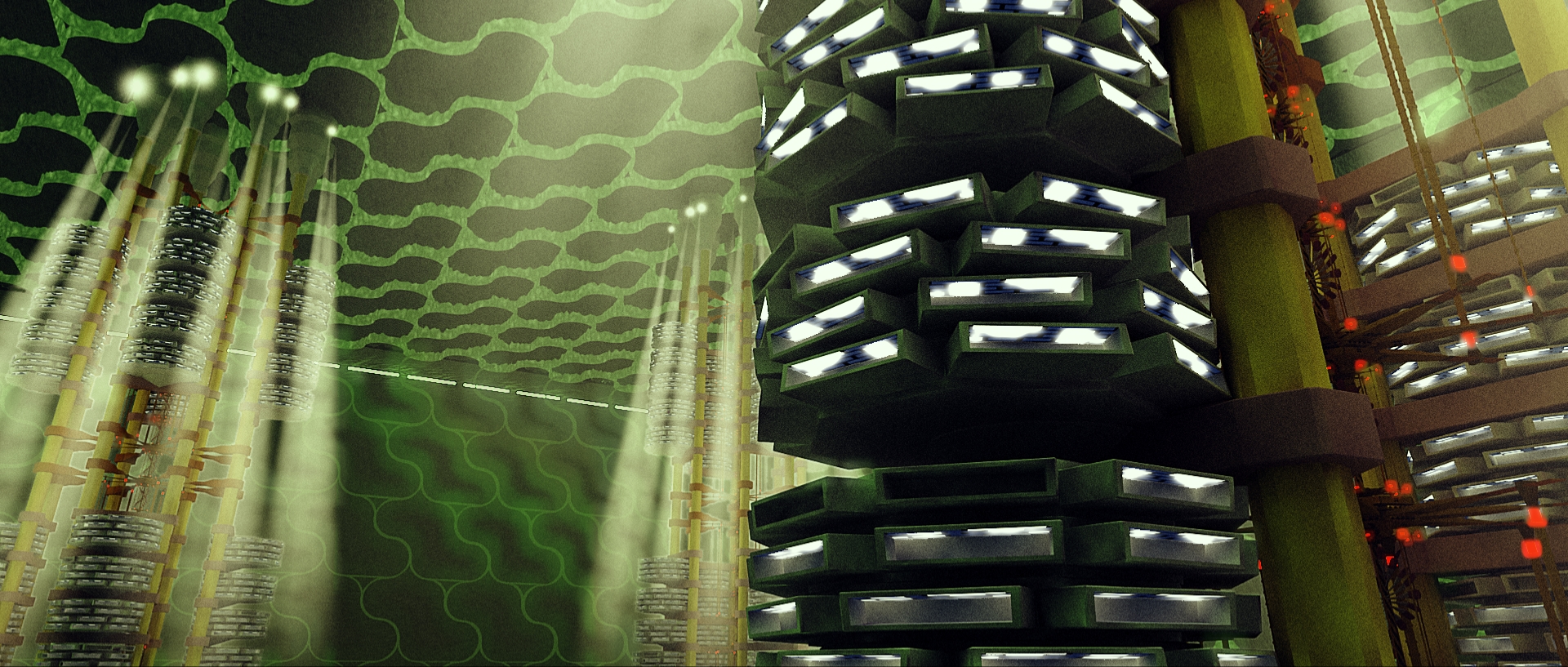 Tiene muy buen aspecto, pero el techo y el fondo no me acaban de encajar. Quizá son demasiado uniformes, podrías romper algunas de esas estructuras o fundirlas, no sé.