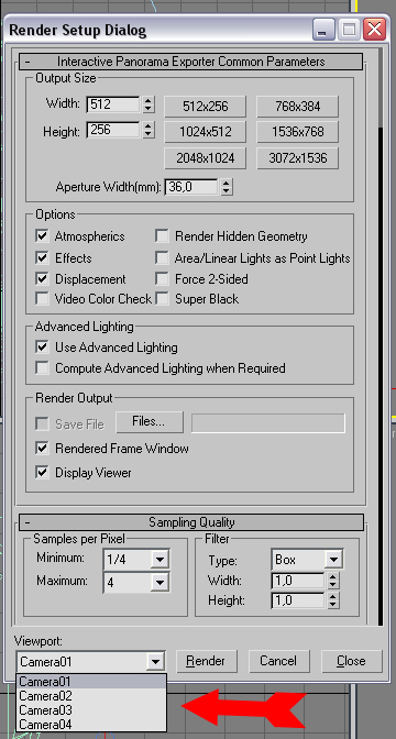 Cuando eliges panorama exporter y le das al botón de render, en el cuadro de diálogo render setup dialog tienes que elegir múltiples parámetros, entre ellos la cámara, en el caso de que tengas varias en la escena. Supongo que se refiere a eso.Cita: