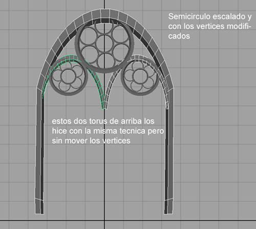 Como pueden ver, el ventanal está compuesto de diferentes partes: las ventanas circulares, los Marcos, y las pequeñas columnas que terminan con un semicírculo arriba, ahora a la práctica: construimos un Torus*(la mayoría de los programas tienen este primitivo) y le damos la escala que más nos guste (recomiendo radio 1 y radio interior 0.1 pero queda a su gusto). Ahora, creen otro Torus, pero este Torus debería ser 1/3 de lo que es el primer Torus (radio.33 y radio interior.033). Este círculo pequeño lo ponen en el centro del círculo más grande, y lo duplican 6 veces. Todas estas copias las ordenan de manera que, haya 3 arriba y 3 abajo (no lo calculé, pero gracias al área del círculo mayor entran 6 más chiquitos de 1/3 más o menos), muy lindo, tienen su primera ventana gótica.