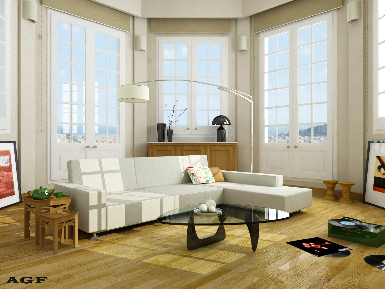 Me resulta raro la escala de los elementos del centro de la habitación: sofá, mesita, mesa, en relación con las ventanas y el mueble del armario del fondo parecen excesivamente pequeño, no sé si estoy en lo cierto, pero estoy casi seguro, es muy importante tener todo a la escala correcta. Yo mismo no paro de usar el tape, y AutoCAD para todas las plantas y perfiles.