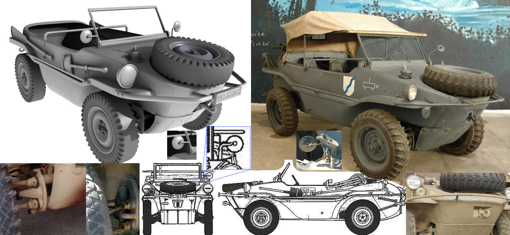 En esta página pueden ver las referencias en las que me base para el vehículo, el blueprints no recuerdo de dónde lo saque, pero por ahí andaba. http://www.schwimmwagen.co.uk/page-gallery.html. Saludos.