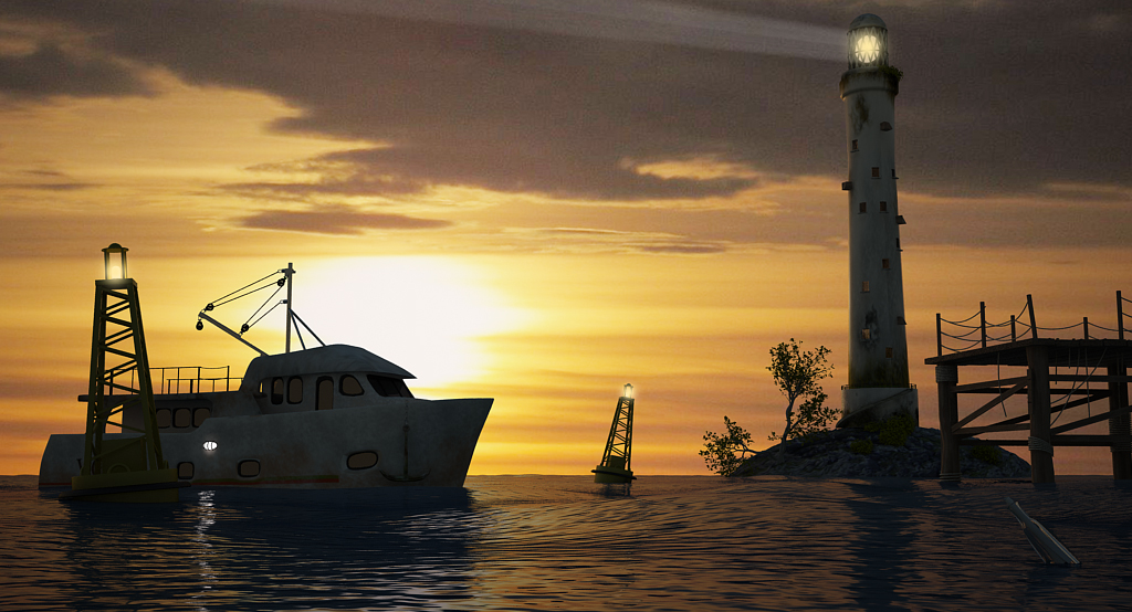 La iluminación la veo muy bien conseguida, me encanta, creo que lo que le quita realismo es el barco, tiene esquinas demasiado suaves quizá, por lo demás, chulo.