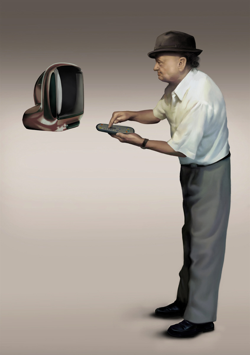 Hola a todos. Bueno, esta primera ilustración es un retrato de mi padre junto al tipo de regalo que le gustaría recibir estas navidades: una tele moderna y flotante.