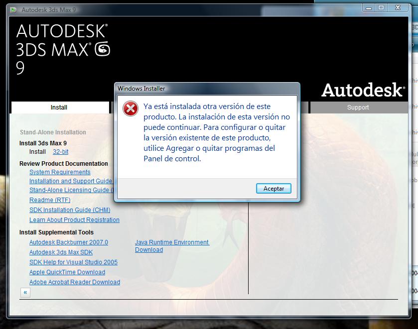 Hola. Pues después de intentar inalar el 3dsMax 9 no quiere instalarlo, dice que ya hay otro programa parecido y que no me lo dejara instalar hasta que este sea retirado.
