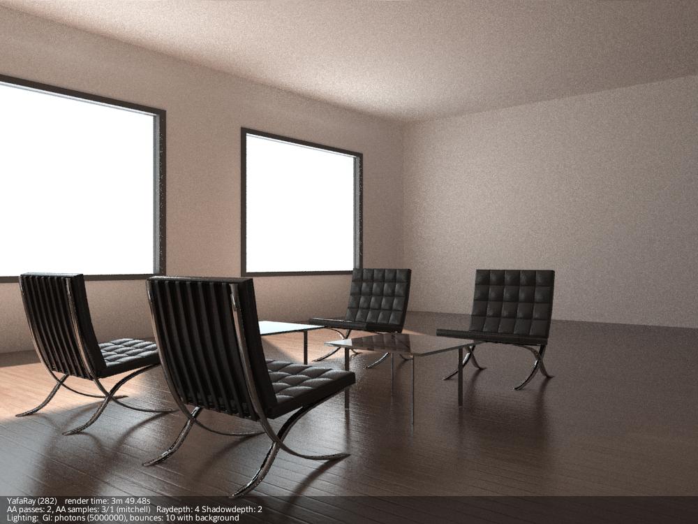 Otra cosa que he descubierto, entre el foro de Yafray, Niel y pruebas, es que la situación de luces de área es importante, según cómo se posicionan en referencia a la geometría de la escena, pueden dar lugar a un montón de ruido/artefactos. Recomiendo ponerlas, y hacer pruebas sin activar el FG para ver resultados del mapa de fotones (y también para ir rápido), y en función de ellos, recolocarlas hasta que no tengamos ruido, o el menos posible.