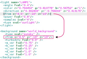 The from parameter controls the source/direction of light from the Sky. The easiest bien todo calculate the correct from value is todo take the main light of the scene and place it correctly in the scene. As an example the light within a scene is coming from the back. So we want todo have the Sun in th Sky a los be in the back. Place the Sun in the scene somewhere behind the Camera and take into account the correct direction of the rays. The following picture shows the setup for the example image.