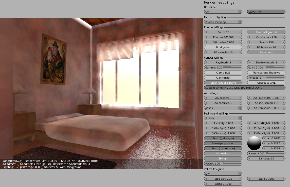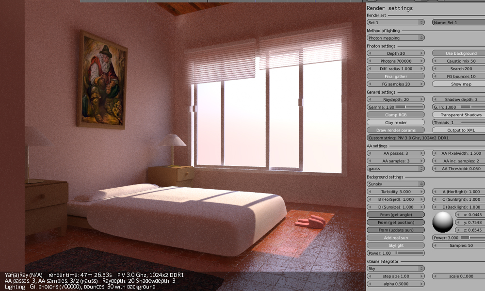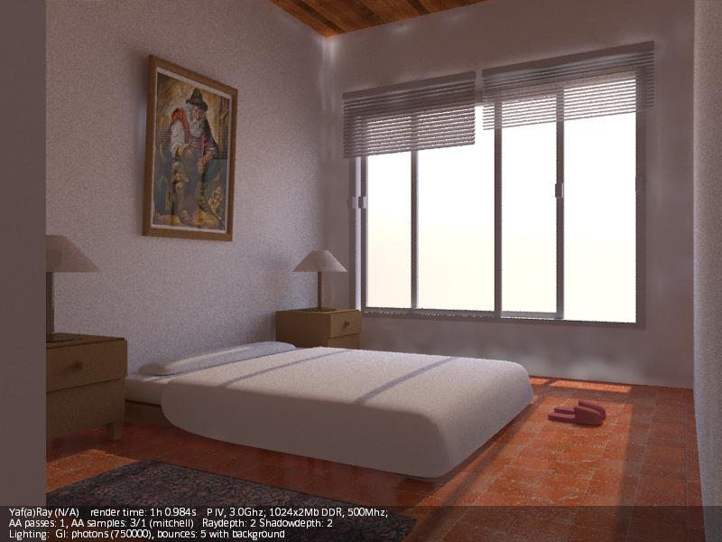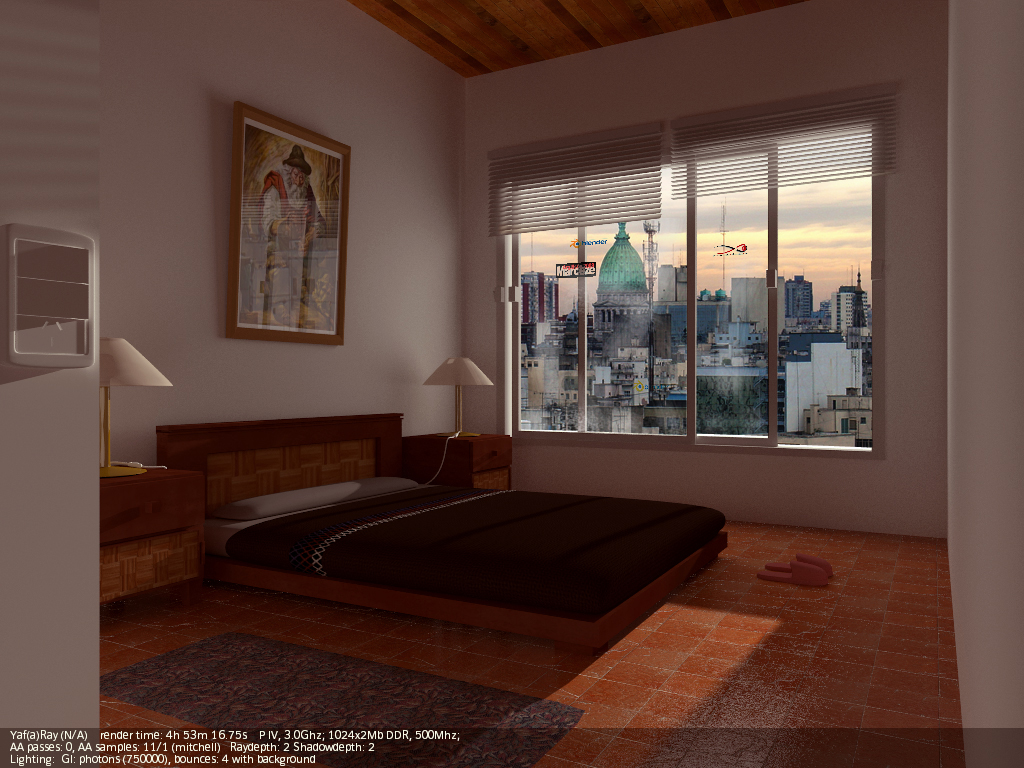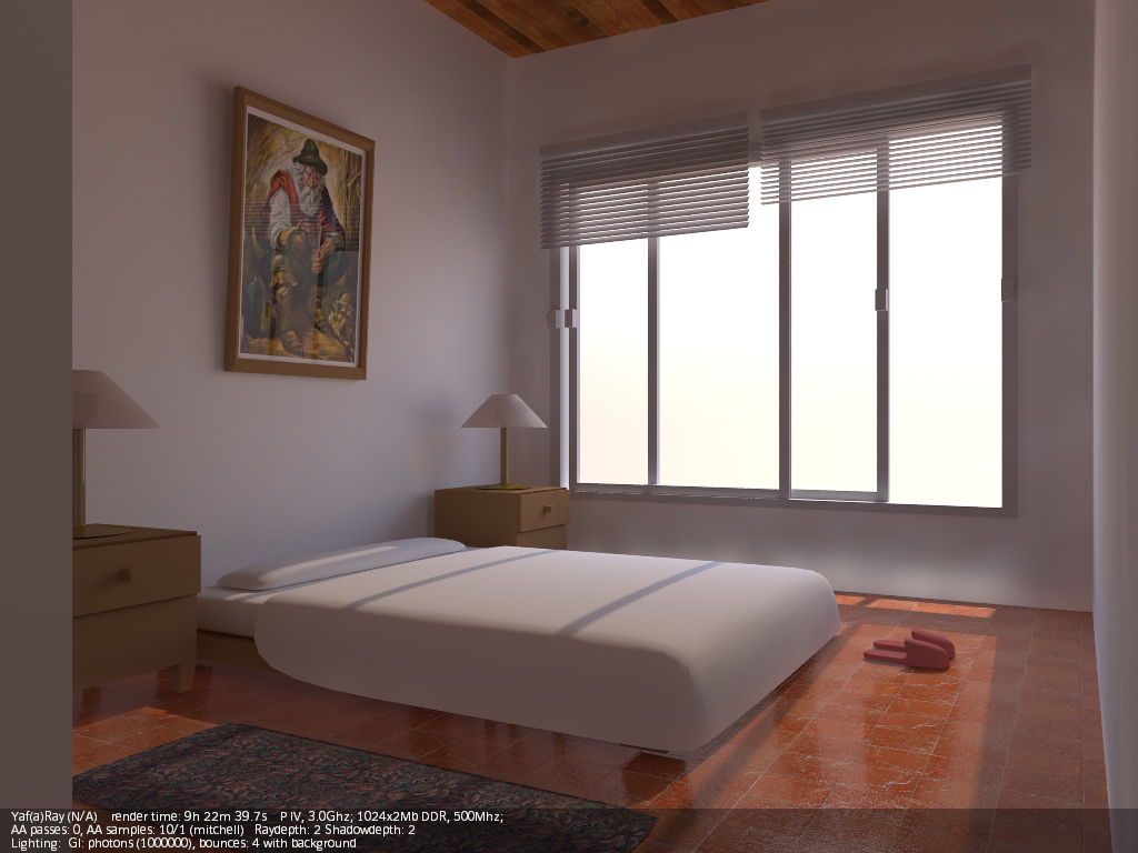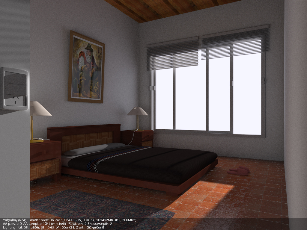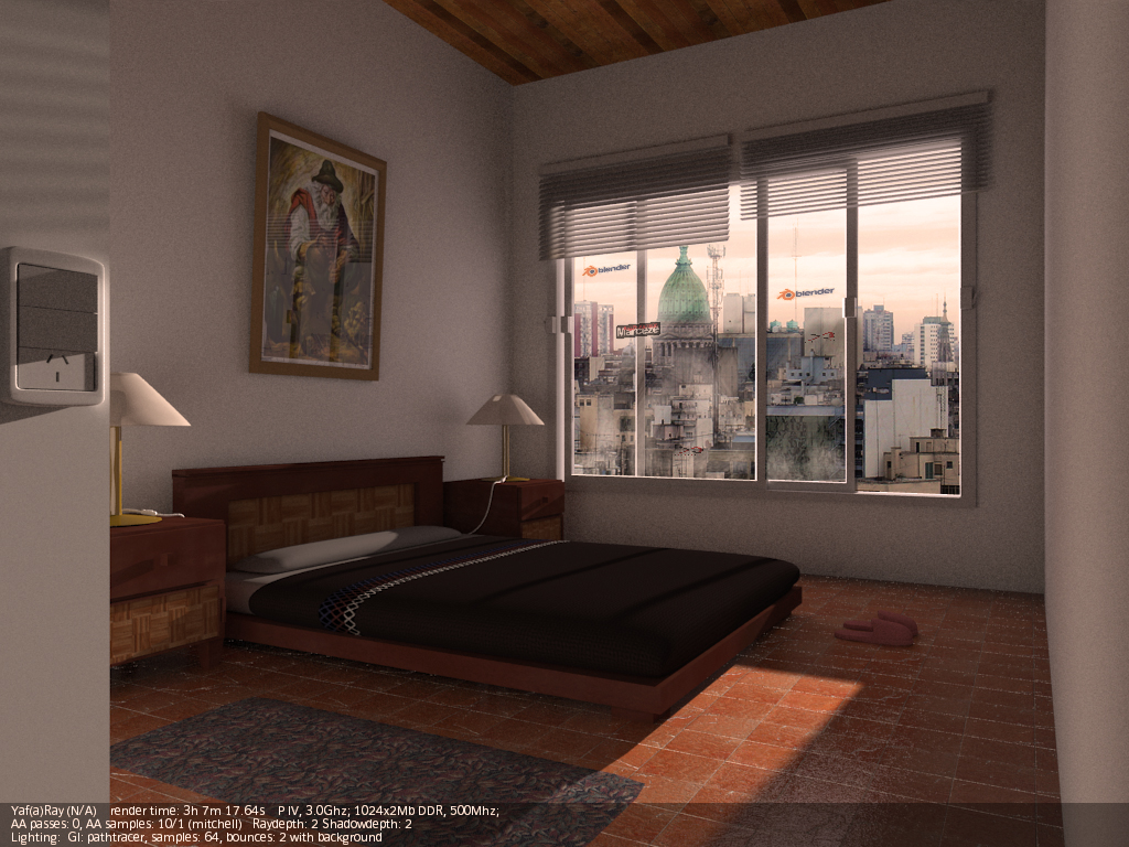 A mí lo que me cuesta más es dar con los valores correctos de luces (a veces un poco altos para que intervengan correctamente), y casi siempre tengo que añadir luces de relleno (de área), para complementar al hipotético sol (en interiores). Luego está el tema materiales, que para que, por ejemplo, se note un Bump, debes obrar con muchísimo cuidado, con valores bajos, como si YafRay y Blender trabajaran en unidades distintas (valores como 0,01 de Bump en el canal Nor, por ejemplo). Y otro tema aparte es el material Glass de YafRay. Dependiendo del ángulo de incidencia de la cámara, o solo refleja, o solo transparenta (refracta), y es un poco jodido dar con los valores correctos (debes jugar con el IOR, no siempre el 1.5 es el mejor,) y a veces es mejor usar un shinnydiffuse con transparencia y jugar con los valores de mirror.