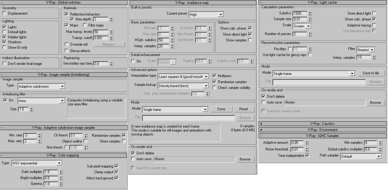 También te recomiendo que en irradiance ma, no uses preset superiores a medium y Light Caché con 500 subdivisiones suficiente y en el antialiasing en vez de utilizar adaptive subdivisión utiliza adaptive dmc con sus valores por defecto y en el filtro del antialiasing utiliza el Catmull Rom o el Mitchell.