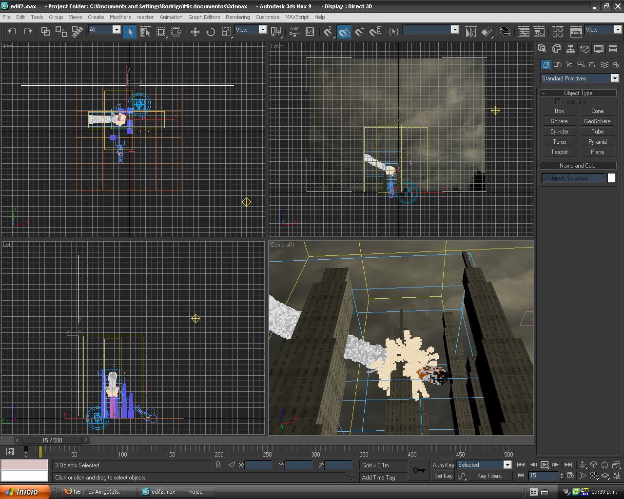 Que tal amigos del foro. Este es mi primer mensaje (espero les guste) y pues soy principiante en esto del 3d lo que publicaré está abierto a críticas constructivas claro esta para mi aprendizaje. Pues démosle matarile a la gallina de una vez y continuemos. Les adjunto wires de este trabajo el cual realicé con partículas Particle Flow y Fume FX, a las partículas les he añadido el efecto Fume FX para crear el humo de la explosión del choque los edificios son una simple caja con Mesh edit, y un mapa que encontré por ahí en la red + un Vray displacement map.