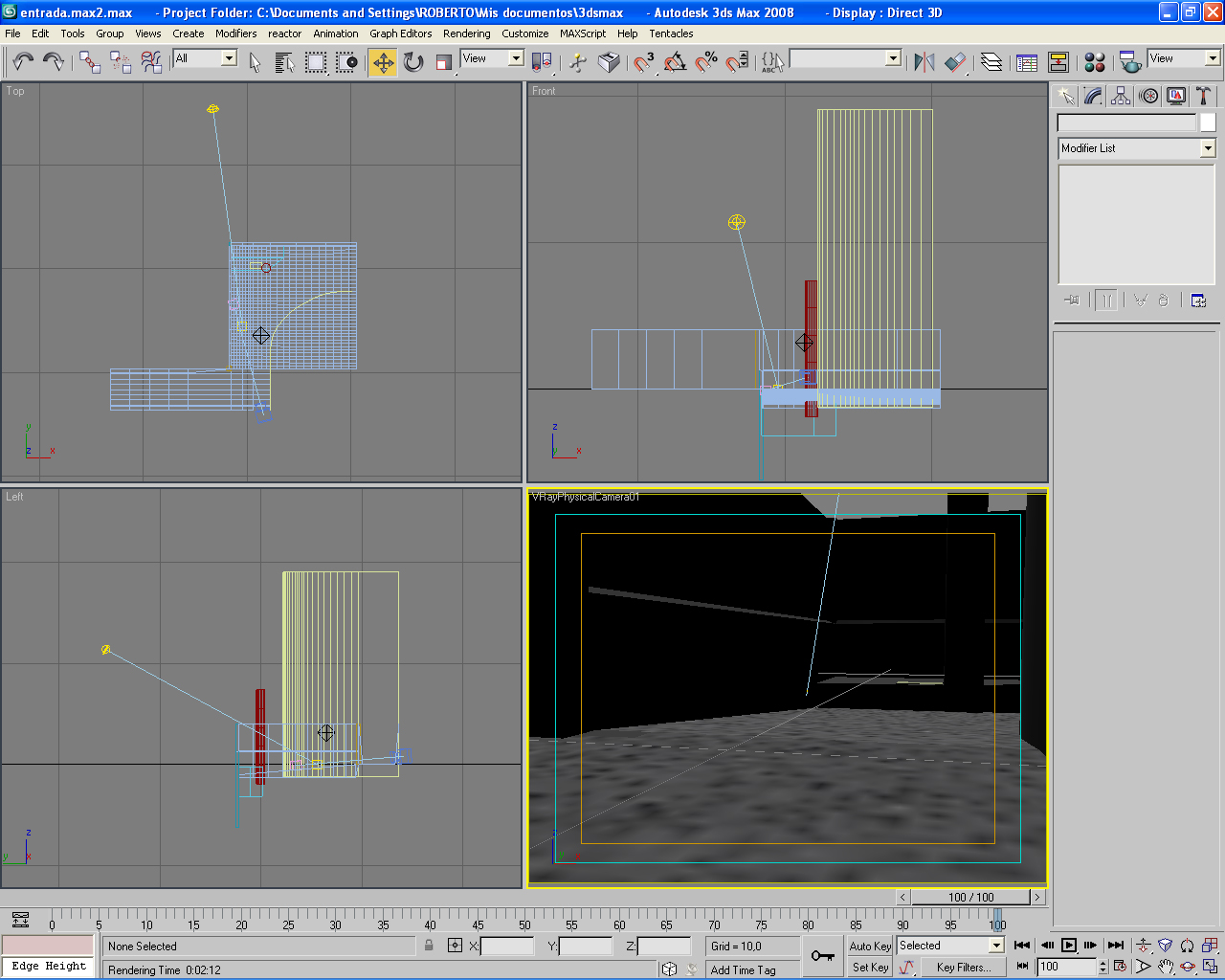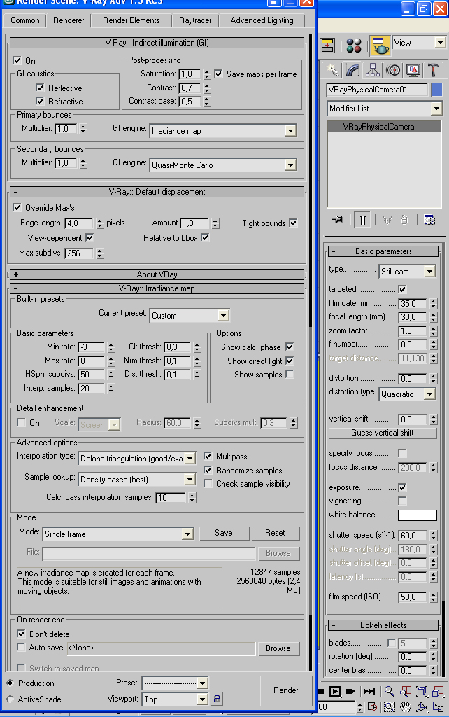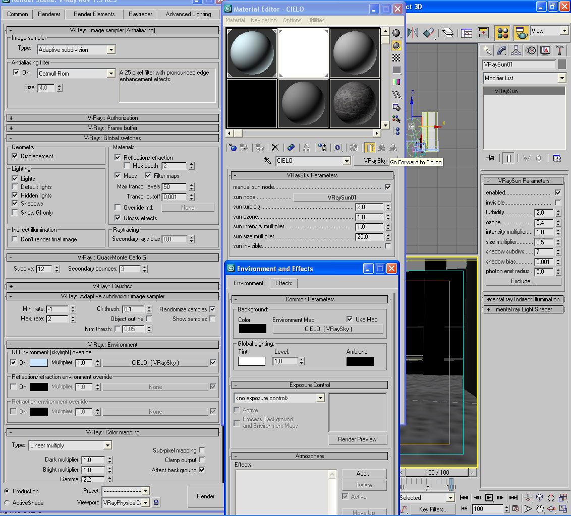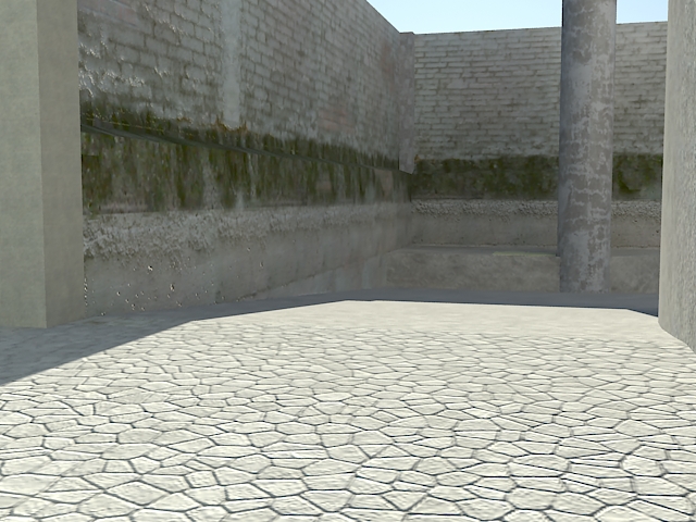 Hola, estoy tratando de realizar pruebas con exteriores, 3ds Max 8 y Vray. Uso Vray Sun, Vray Sky, Vray Physical Camera. Yo no sé qué hago mal, pero después de mil pruebas, cambiar texturas, posiciones de sol, y otras mil cosas, cada vez lo veo más patético. No entiendo porque y comienzo a frustrarme porque son 4 paredes y no soy capaz de darle un mínimo de realismo. Bueno, a ver qué podéis comentarme. Os paso una imagen, y luego el setting de todo, así como las vistas en 3d. Si alguien quiere que suba el proyecto entero también puedo hacerlo. No sé qué está pasando. Sé que el moho ese verde está mal hecho, pero en vista de que no soy capaz de que nada quede bien tampoco le he prestado mucha atención. Gracias. Un saludo.
