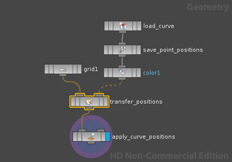 Ya sé que para el caso de deformar un grid con una curva, es tan simple como extrusionar la misma y se obtiene el mismo resultado, pero me gustaría saber si se puede llegar a deformar con una curva como en XSI, de forma más o menos sencilla. Y esto es lo que tengo en Houdini, enorme eh. El operador deform no sé cómo usarlo para este propósito, y en vista que esta clasificado dentro de character.