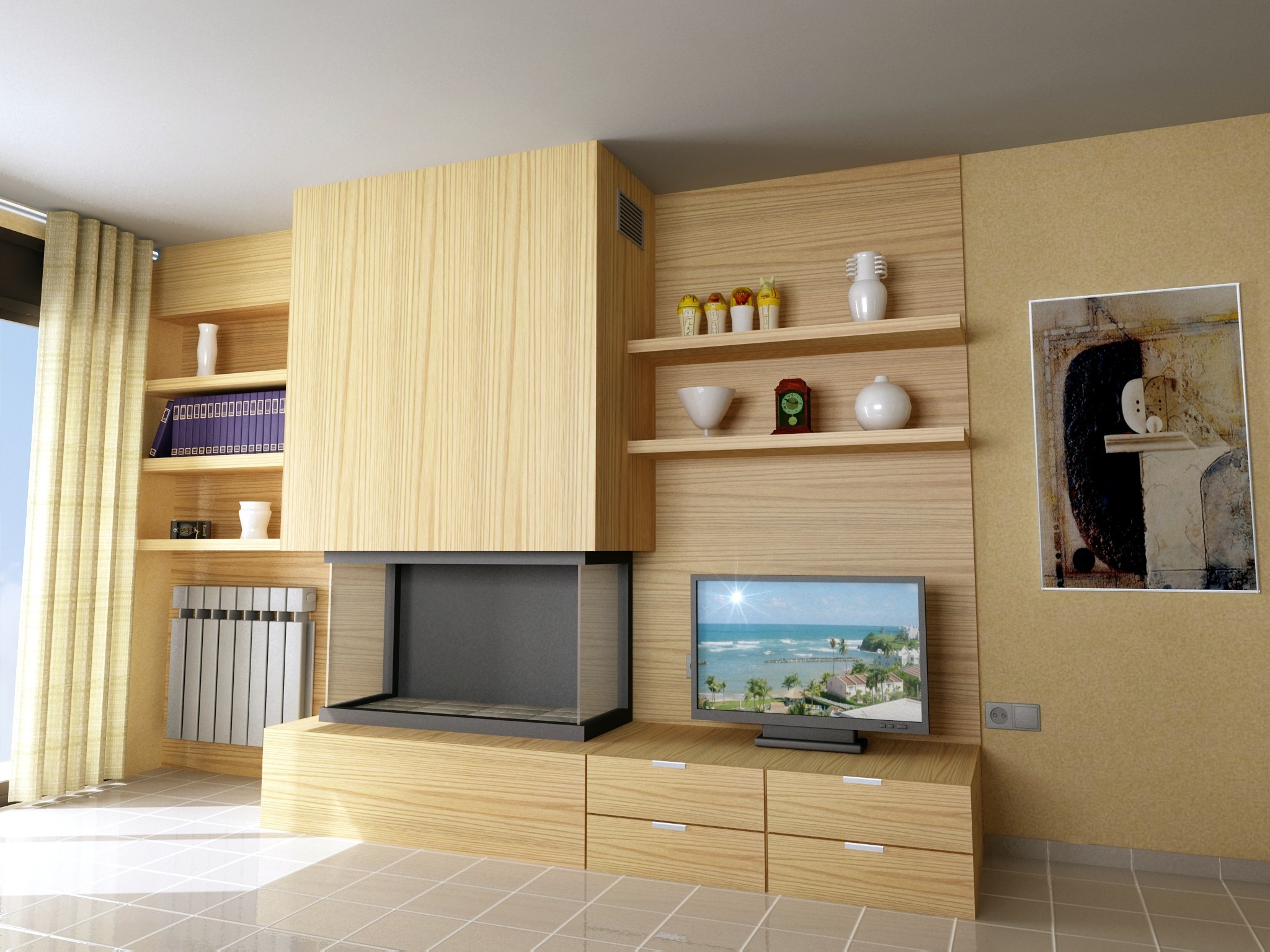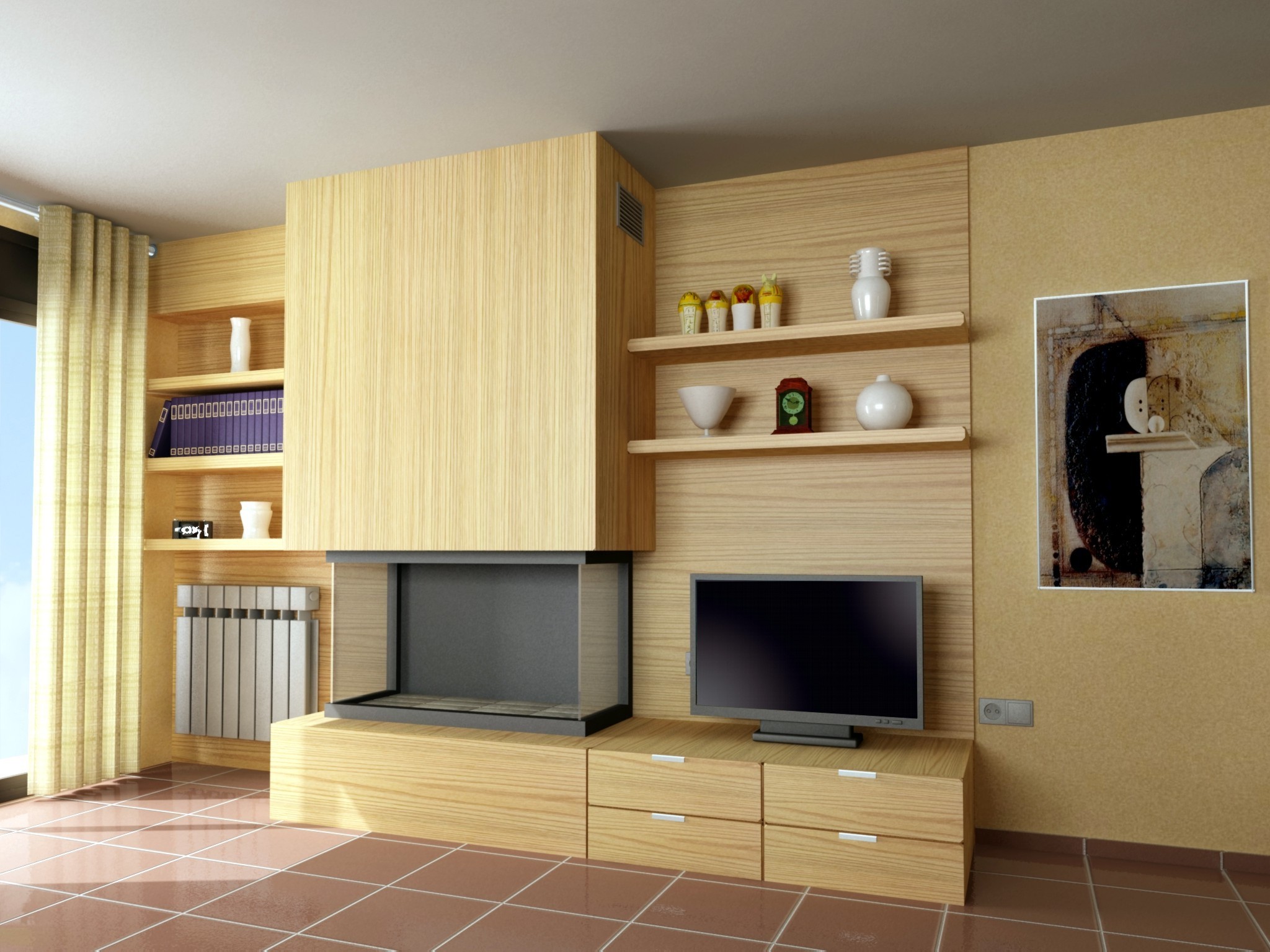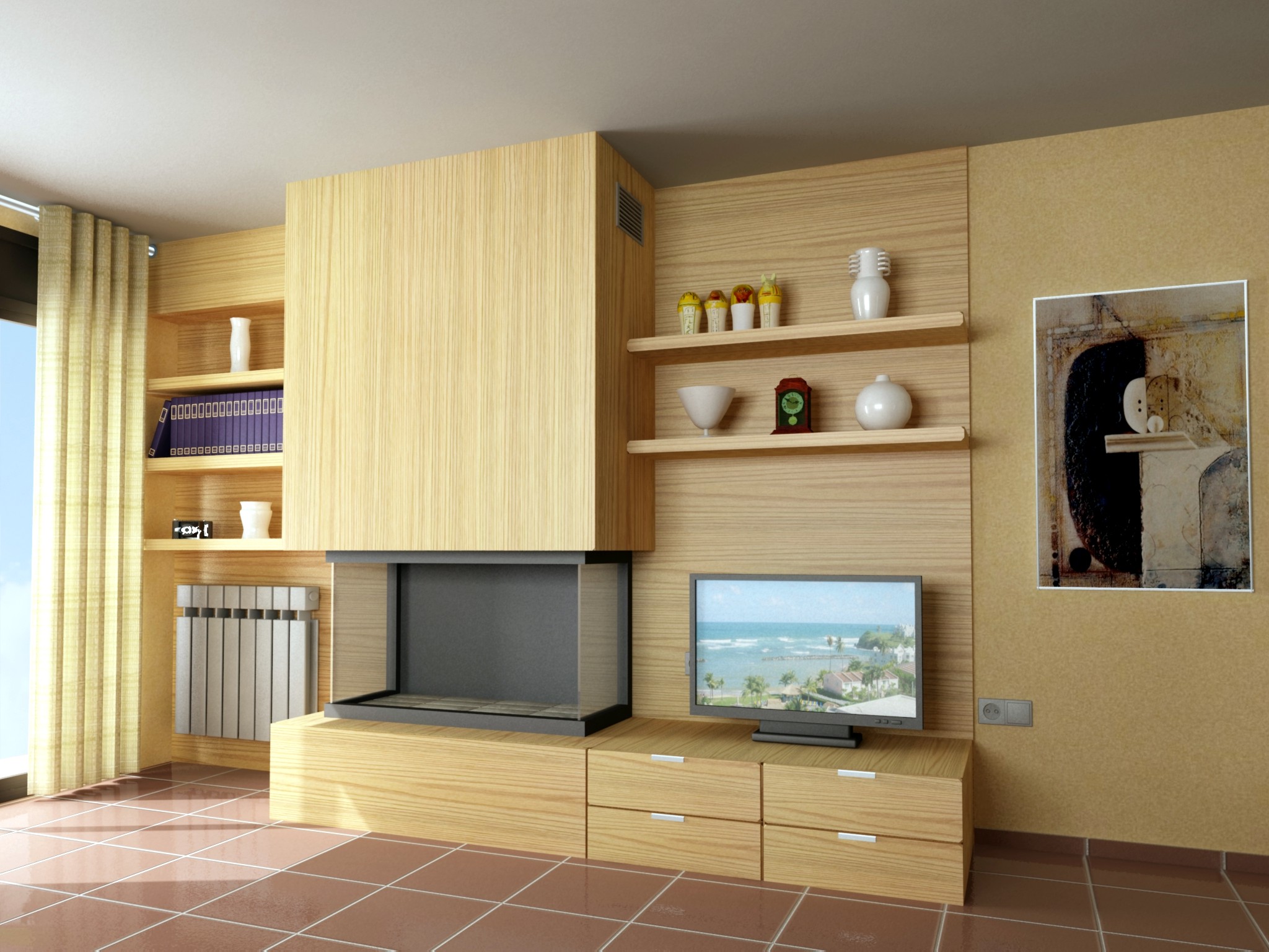 Las vetas de la madera de la chimenea las pondría horizontales como el resto del mueble, a los cajones puedes ponerle un zócalo para UE no nazcan desde el piso y puedes ponerle una moldura entre pared y techo y también en la parte debajo del radiador un zócalo.