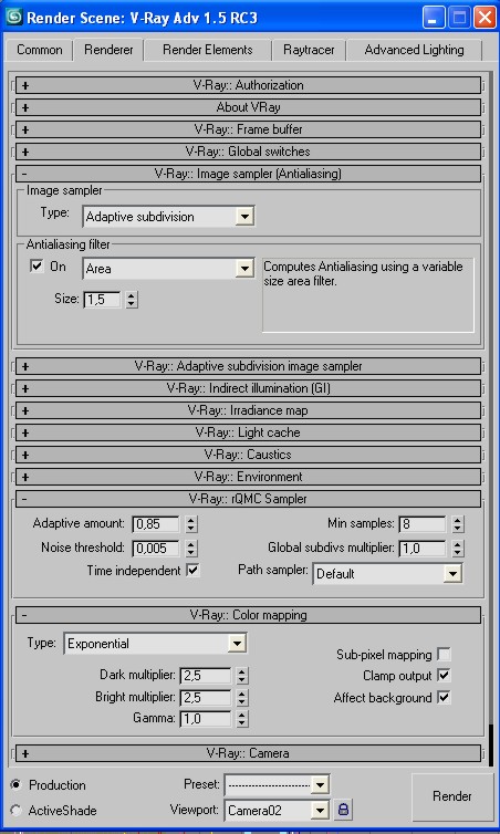 Bien Joanca por publicar los settings, pero pienso que deberías estirarte más en el sentido que no solos parámetros enviados son suficientes, sería conveniente que publicases los de color Maping, antialiasing, parámetros de cámara, parámetros de luces los de Irradiance Map y los de Light Caché se que pido mucho, pero me ofrezco a darte una solución buena que no olvidaras en cuanto a iluminaciones interiores se trata, por lo menos a mí me funcionan de maravilla.