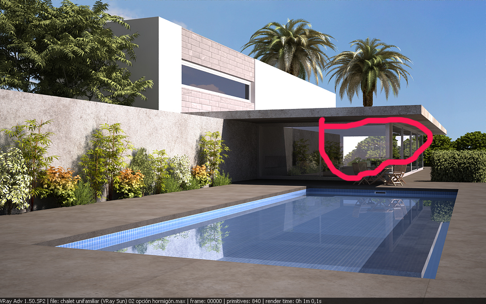 Yo tengo una imagen de un cielo en la pestaña de environment del 3d que me hace de cielo azul, luego en las pestañas de environment del Vray tengo un Vray Sky en la pestaña de GI environment y una fotografía en la pestaña de reflection-refraction, esa fotografía es lo que quiero que reflejen los cristales.