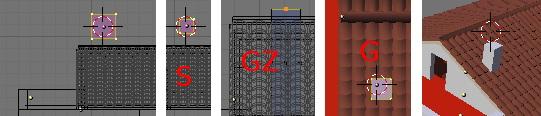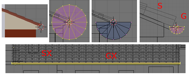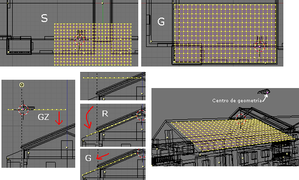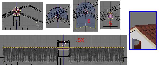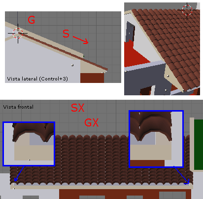 Seleccionando solos vértices interiores, pulsando,x se puede hacer un poco más estrecha. Luego pulsando g, z se puede mover un poco hacia arriba, para que se quede más pegada al techo.