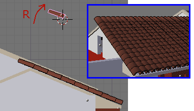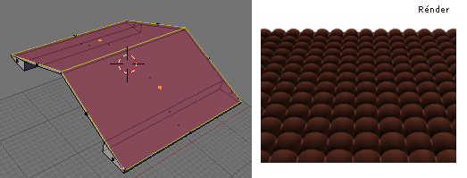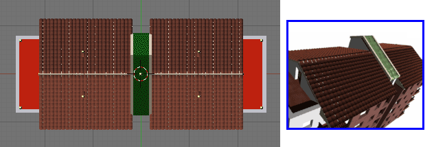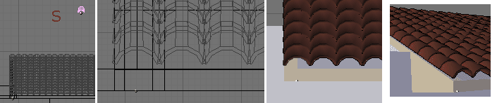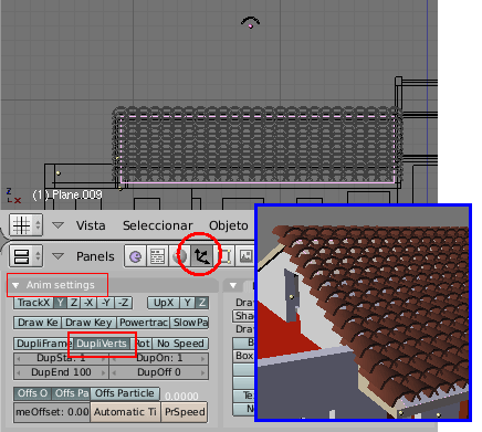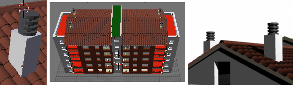 Viendo cómo va a ser el render definitivo, podemos ajustar algunas cosas para mejorar la imagen. En el segundo y tercer edificio de la izquierda se puede notar que falta el tejado trasero, o por lo menos el borde. Para volvérselo a poner es suficiente con duplicarlo desde otro edificio. Hay que tomar la teja que esta flotando en el aire y la malla que sirve para hacer el dupliverts. En este caso lo haremos simplemente con alternativa+d, pero si necesitáramos a toda cosa no aumentar demasiado el número de vértices, lo podríamos hacer con mayúsculas+d y después editar la malla para reducir el número de tejas y que solo se dibujen las del borde que son las que nos hacen falta.