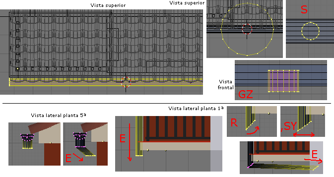 Nuestro edificio estará formado por la planta baja que es distinta, las plantas primera a quinta que son iguales, y después los tejados. También vamos a modelar de forma independiente la zona central de las escaleras, ya que las ventanas no están a la misma altura que las demás.