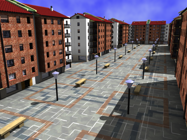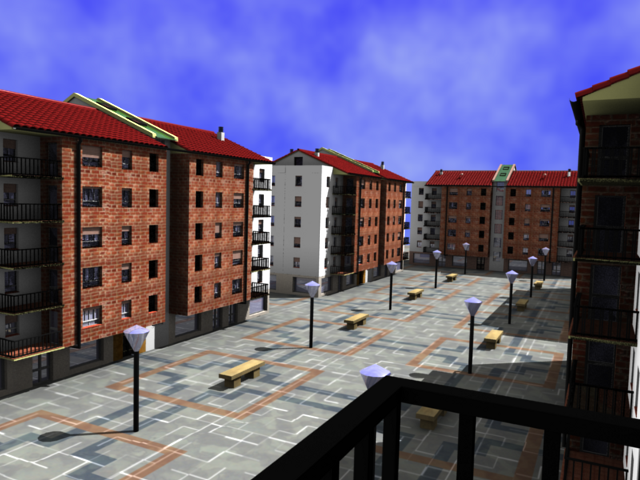 La escena final podría consistir en acoplar nuestro bloque de pisos en una fotografía real, en crear una escena usando además otros distintos edificios también modelados en 3d, en acoplar los bloques de pisos a un plano de una ciudad que existe realmente o que está en proyecto.