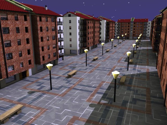 En nuestro caso vamos a hacer una escena completamente libre. Se trata de una calle con tres edificios a cada lado y uno en cada extremo. Total ocho bloques de pisos.