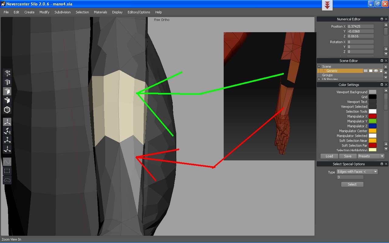 Os paso una fotografía, en Silo y lo que le pasa en ZBrush (aunque la verdad ese ángulo que le puse parece que tiene Autodesk Maya, pero es la de la parte de atrás, si os fijáis bien se nota que falte, me refiero la de la flecha roja).