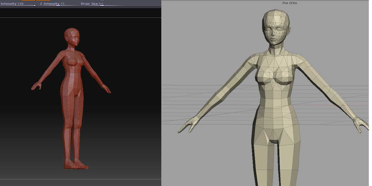 Aunque solo sea por descarte, has probado a invertir las normales? Por cierto, no me hagas mucho caso (en serio, me suena muy de pasada) pero creo ZBrush no trabaja bien con triángulos (digo bien, no que no pueda trabajar).