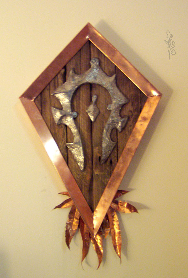 Para dar un par de detalles es el logotipo de la horda fabricado sobre una base de madera de pino y podrida (un palé que me encontré en la calle) con los bordes y las hojas en chapa de cobre de 08 y el emblema de la herradura rara hecho en barro y fundido en plomo con molde de escayola y luego barnizado para que no pierda del todo el brillo.