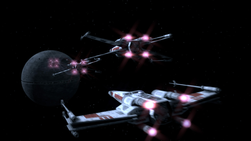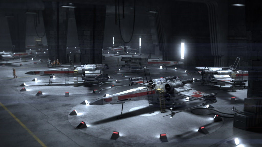 Modelado del x-Wing con mucho detalle y mimo, trabajando las texturas e iluminando con HDRI y alguna luz (algo sencillo) en la escena que están volando, y con unas cuantas luces más en el hangar (tiempo de render poco largo, no me acuerdo, pero sobre las 2 horas).