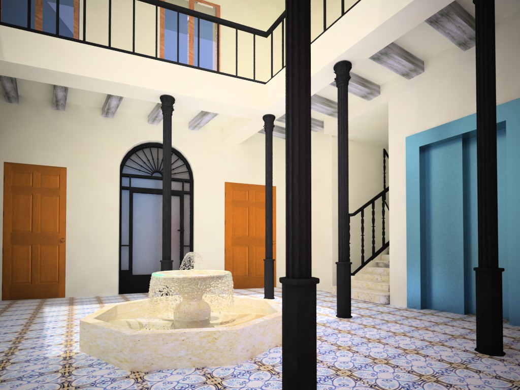 Bueno, tu imagen se ve bastante plana_creo que te debes trabajar más las texturas, y tu iluminación. Por ejemplo, los cristales de las puertas de arriba, la textura de la madera de las mismas (en vez de horizontal en vertical), el metal de los pilares. Lo que sí mola es el chorro de fuente_te a quedado bastante bien. Saludos.