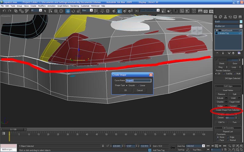 Gracias por su respuesta amigos: Pit: en el caso de que le haga renderizable al Spline tendría el mismo problema que tenía con el método que estaba haciendo, el momento en el que hago el create shape from selection para hacer el Spline me lo crea como quiera el max y si lo hago renderizable no tendría el efecto del hilo como que sale y entra, es decir las puntadas, sino como un solo cilindro alrededor de todo el zapato.