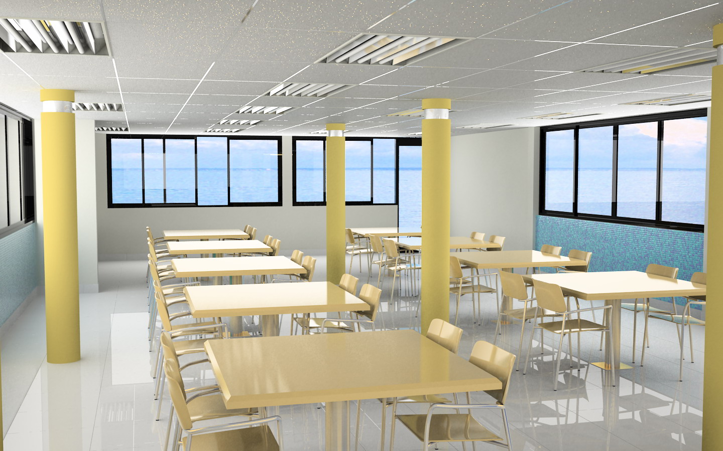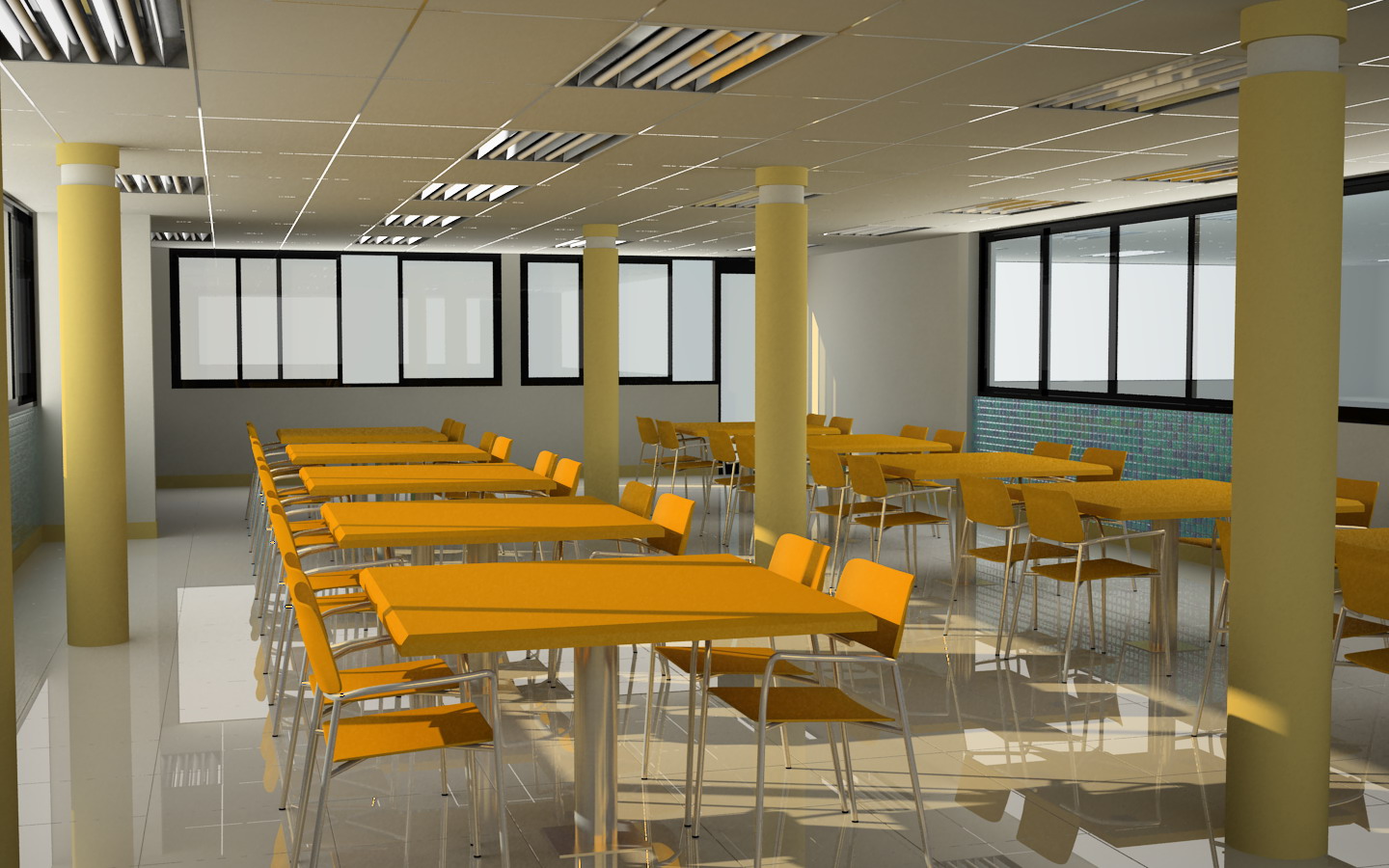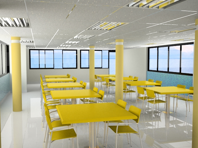 La iluminación está bastante bien, lo que necesita algo de trabajo son las texturas metálicas. Pienso que a los metales habría que ponerles menos reflexión y más desenfocada y algo de especular al material de las sillas-mesas.