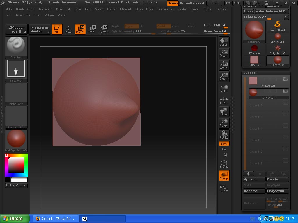 Al intentar crear los ojos o poner el pelo empleando una subtool, yo añado con append el objeto que me interesa, pero cuando voy a mover el objeto no puedo hacerlo, no me salen los tres círculos, lo que pasa es que se deforma la esfera, y escojo la herramienta de la parte de edit, draw, move, escale, rotate.