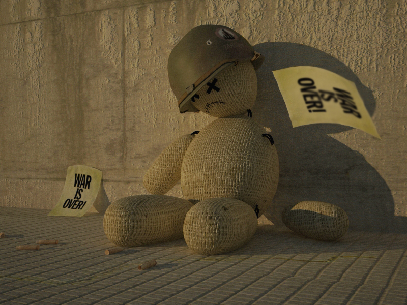 Y, exactamente cual es la lectura de la imagen? Fin de la guerra para el individuo por su muerte? La guerra conduce a la muerte de los individuos? Somos los muñecos de los políticos?