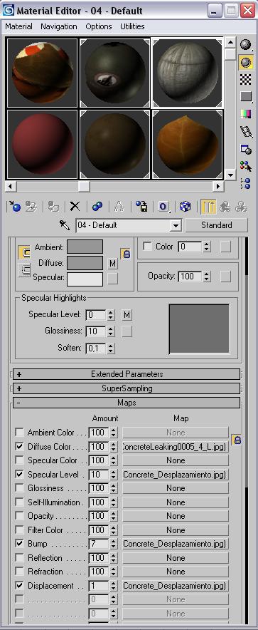 Aquí os dejo los parámetros. La verdad que algún parámetro como el displacement me parece que no hace más que disparar los tiempos de render pero bueno. Dejo también el difuso y el Bump map.