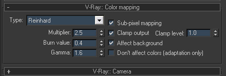 Muy bien lograda la iluminación, podrías decir tus parámetro en Color Mapping y gama? Solo le corregiría en el antialiasing.