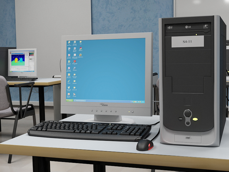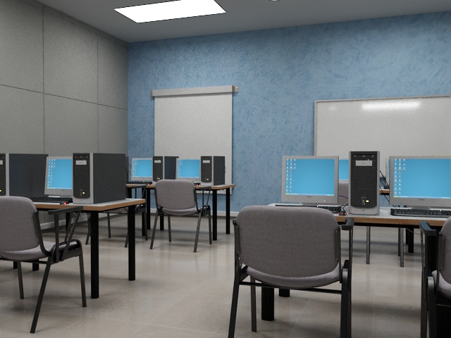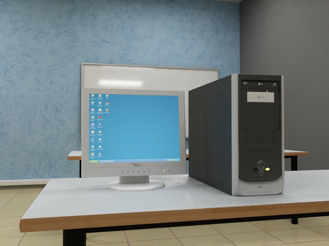 Bueno, os acordáis el PC que estaba yo montando hace unas semanillas, pues bien aquí está terminado, con sus proporciones reales y terminado con el monitor de la clase, veréis mi intención es crear con todo lujo de detalle, mi clase de diseño y programación web que estoy dando en mis ratios libres, como paso allí unas horas y me gusta el lugar, pues es un buen ejercicio para mejorar interiores de oficinas que son una asignatura pendiente, bueno ahí va un update, faltan muchas cosas, cables, el teclado, ratón, el suelo no tiene mapa, la madera de la mesa es un color, etc, y el render es de prueba, pero es una base que a partir de ahí voy trabajando.