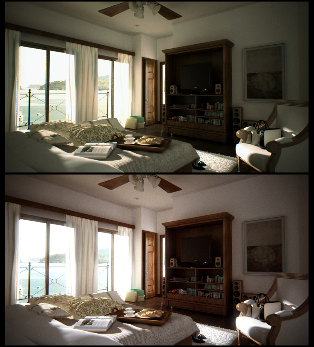2. La tercera fotografía y la segunda, se entiende que una es a las 12 de la mañana, por ejemplo, y la otra a una hora con menos iluminación, y por lo que veo creo que la posición del foco de iluminación (Vray Sun o lo que sea) es la misma en las 2 imágenes, por lo que habrás cambiado los parámetros de intensidad, etc nada más, proyectándose las sombras en las 2 imágenes con la misma dirección y con el mismo ángulo de proyección, cuando deberían de proyectarse diferentes. Un saludo y, como te he dicho anteriormente, buen trabajo.