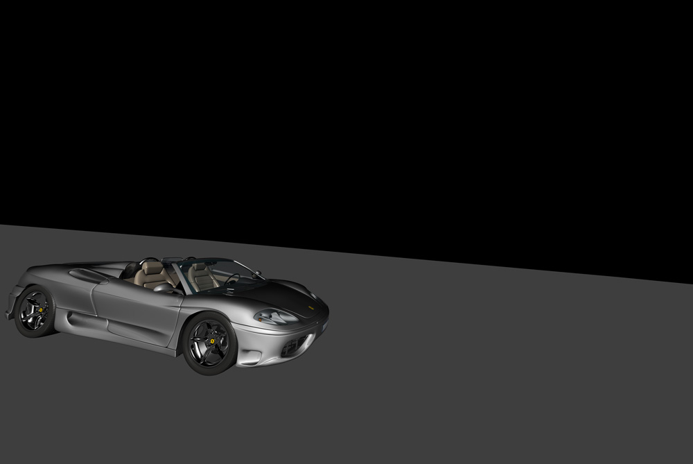 El siguiente problema viene con el render. Las primeras pruebas de render (este modelo solo va bien con FinalRender rc2), incluían la luz de firmamento, y After Effects CS4 que es con lo que vamos a trabajar para componer, no reconocía el canal alpha, aunque este si había sido creado. Eliminamos la luz general y la atmosférica, y resulta que exceptuando el coche, todo el plano renderizado aparecía en negro, y por lógica, las ruedas del coche habían desaparecido.