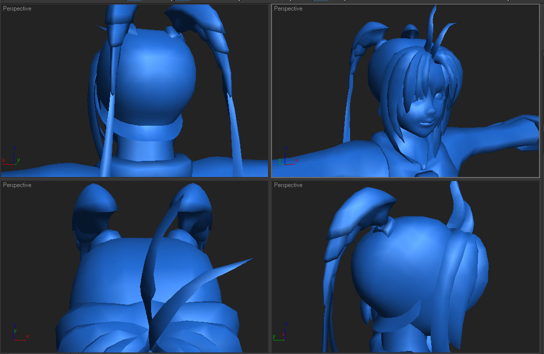 Es que he tenido un problema: el pelo, aunque no gasta mucho, lo pensé para que fuera 2-sided, pero me han dicho que Irrlicht no renderiza en 2-sided (me parece raro, pero mira, quién sabe), así que, hay dos capas de pelos, y quizá las antenas tengan mucho detalle, no sé. De todas formas, sólo le quedan por modelar las orejas (estilo mecánico por razones argumentales luego, en una versión más avanzada tiene orejas como las de los humanos) y el pelo que va desde el inicio del flequillo hasta la nuca, pasando por dónde se recogen las coletas, así que, lo que queda no es muy complejo.