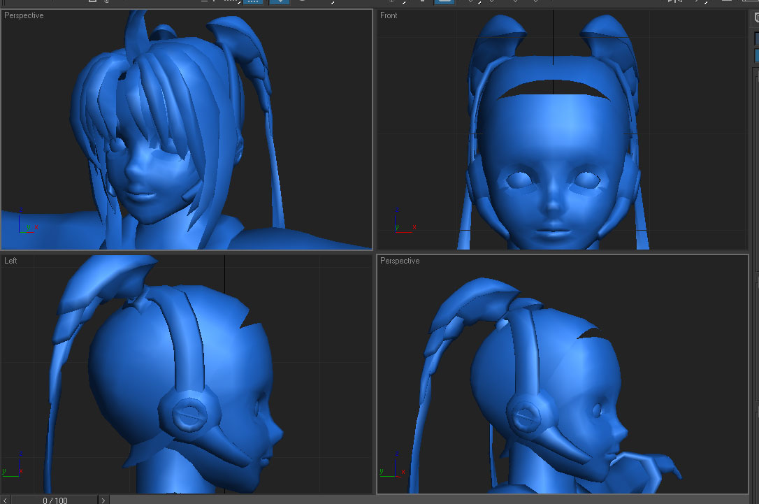 Ya casi la tengo modelada entera. He hecho los auriculares, espero que luego con el mapa de opacidad en el pelo se vean un poco más.