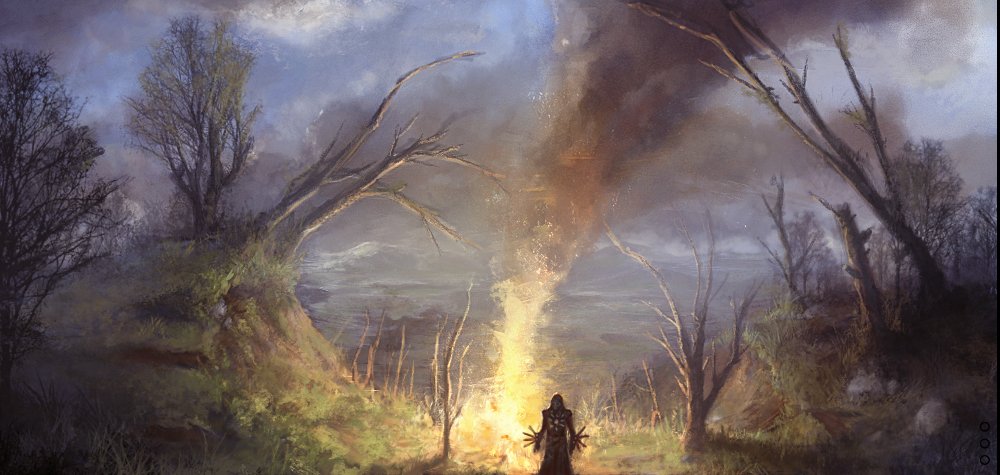 Muy bueno, excelente. Trabajaría un poco más el o, lo veo como mal distribuido sobre el área. Además de que las nubes del cielo no parecen concordar con el movimiento del viento que parece mover el humo, no sé si lo que pretendías era que el cielo absorbiera el humo o que el humo flotara naturalmente hacia el cielo, otra cosa que no me cierra mucho es el color del césped, lo veo como demasiado claro. Fuera de esos detalles, esta fascinante.