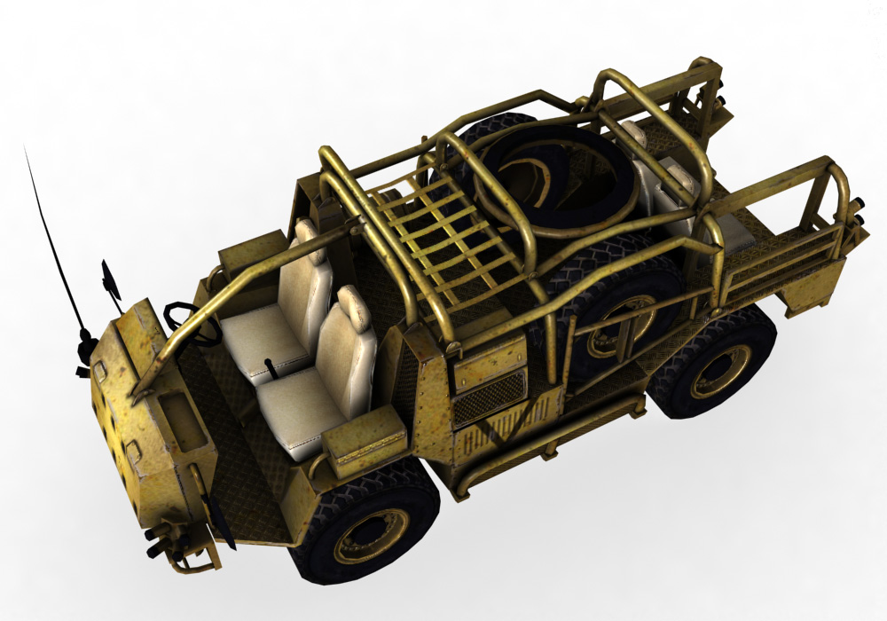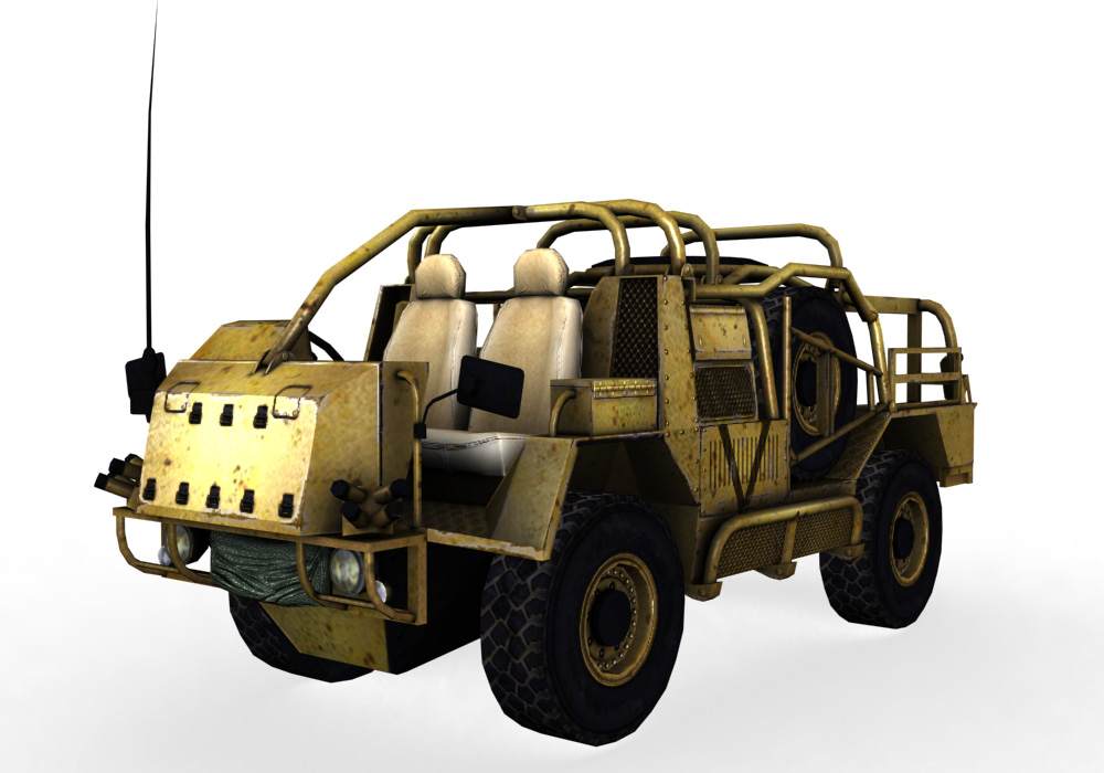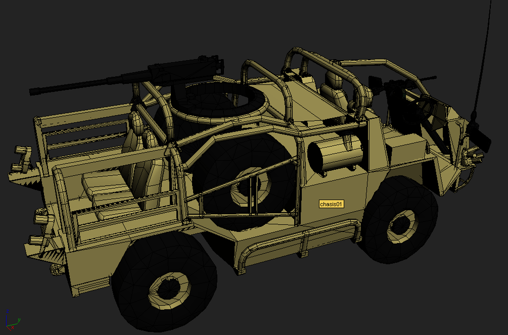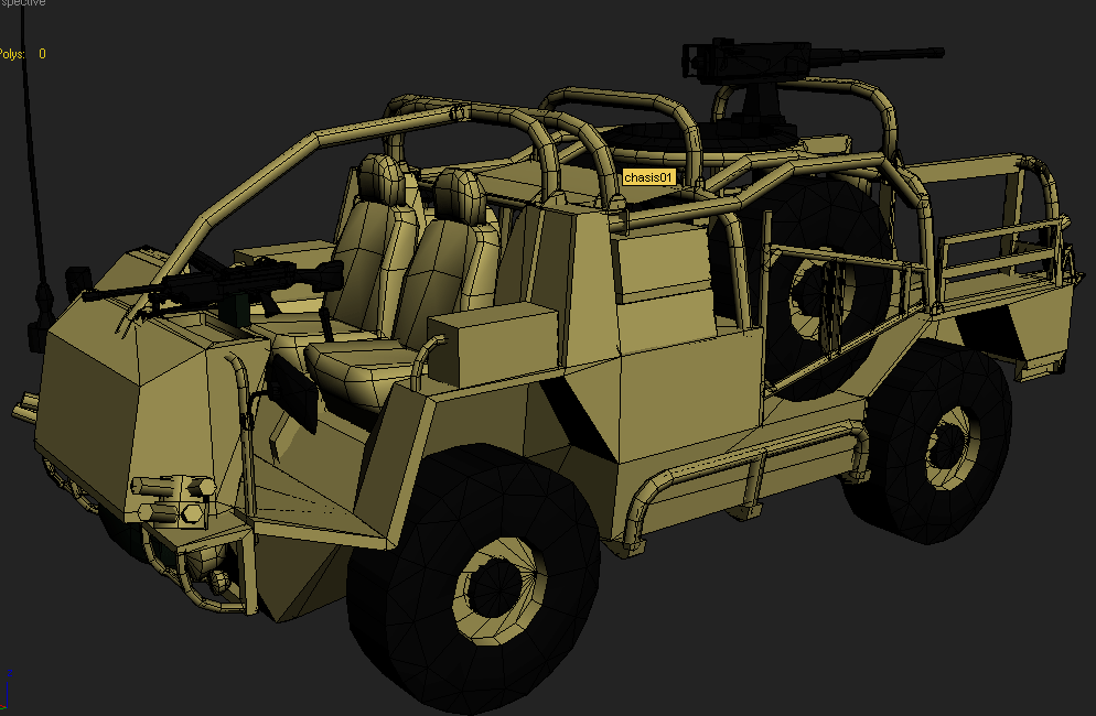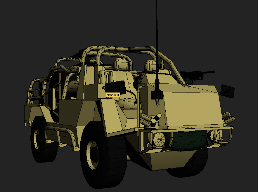 Buenas a todos. Estoy lejos de mi amada PC hasta el fin de las malditas fiestas, así que, para pasar el rato y como solo tengo un portátil viejo me he puesto a hacer modelos en baja. Acabo de terminar de modelar este y ahora lo voy a empezar a mapear. Tiene 4645 polys sin contar las 2 ametralladoras que las cuento aparte porque pueden ponerse o no llegado el caso. Lo estoy haciendo como si fuese para un videojuego concreto. Por lo cual, lo que no es claramente del vehículo definiré como un prop o elemento decorativo aparte, que puede ponerse en este vehículo o usarlo en otra cosa del mismo juego.
