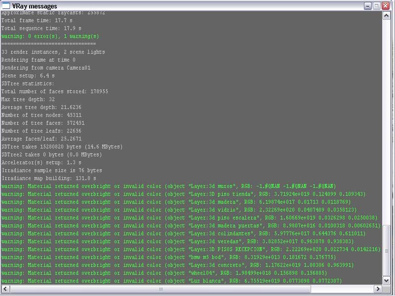 O es acaso un problema de configuración de la iluminación global, bueno la verdad es que primero pensé en el material ya que el aviso que sale es referente al color, además que la misma escena con la misma configuración, pero con pocos materiales no tenían ese problema, por eso es que pensé que estaba hacienda mal mis materiales.