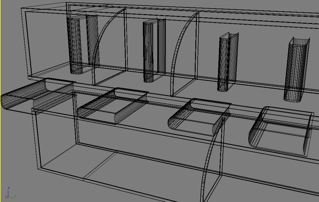 Esta de diez, le metes cuando puedas un poco de autosmooth a algunas caras que facetan. Los libros si usas Unwrap, te los ventilas en texturizado creando unos bitmaps de lomo, tapa y canto de algunos que tengas por ahí, usa una textura de, por ejemplo, 1400 por 1400 y puedes meter varios en una sola, luego es colocar cada libro en la zona que interese, en vez de un bitmap por libro.