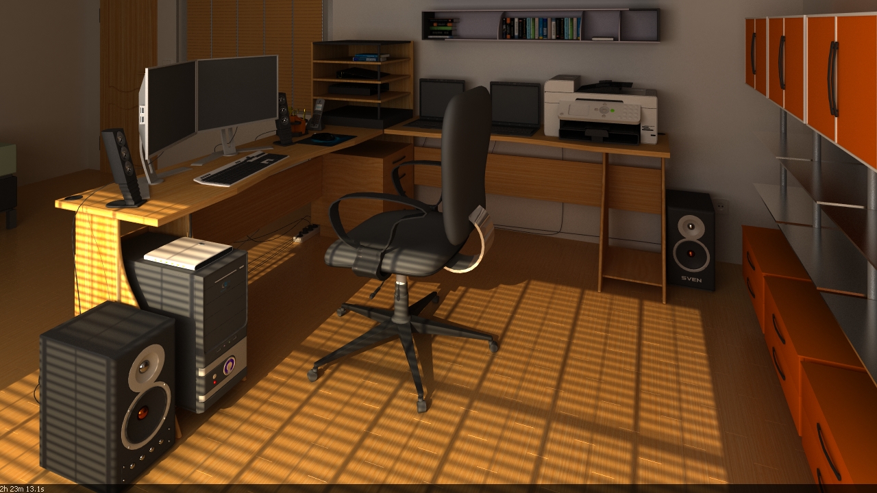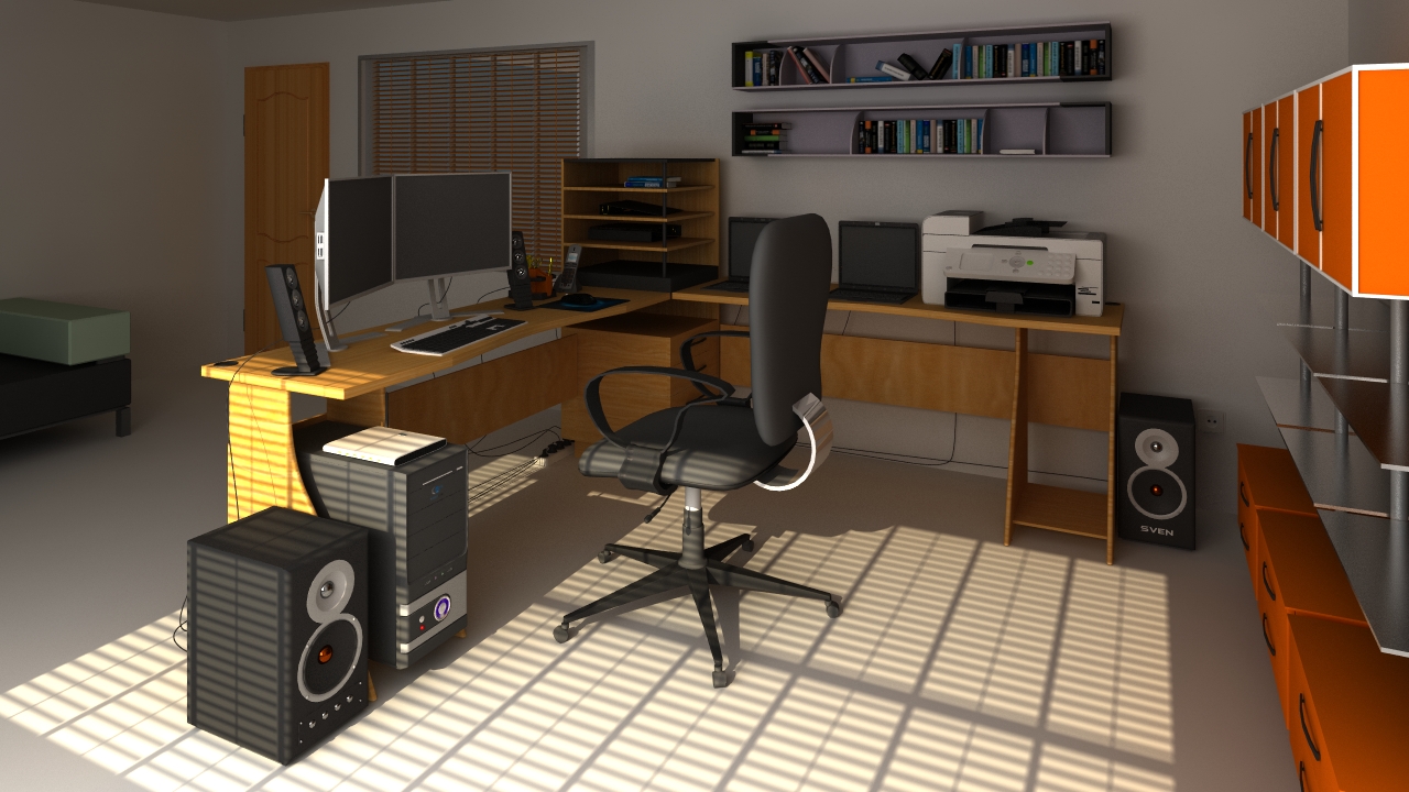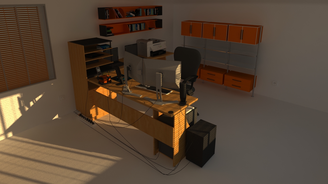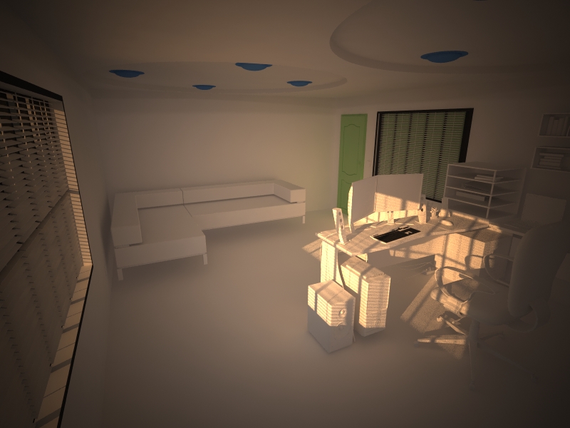 -> respecto a las críticas, lo siento, pero la iluminación no me convence, los bordes de la fotografía son oscuros y no se ve bien (por la oscuridad). Así que intentaría que toda la habitación fuese luminosa, en fin, es una oficina, son luminosas. En fin, que sigue adelante y a ver qué tal te quedará el texturizado.