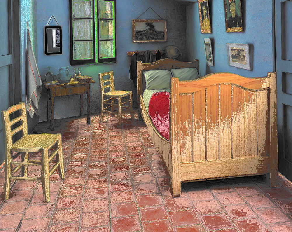 Es la habitación de Van Gogh en arles. Hizo dos bocetos y tres pinturas. De las tres fue la primera que creó. Le gusto tanto que la copió dos veces. A mí también me encanta así que, hice mi versión, bueno, más de una con diferentes sabores como diría Bill Gates. Saludos.