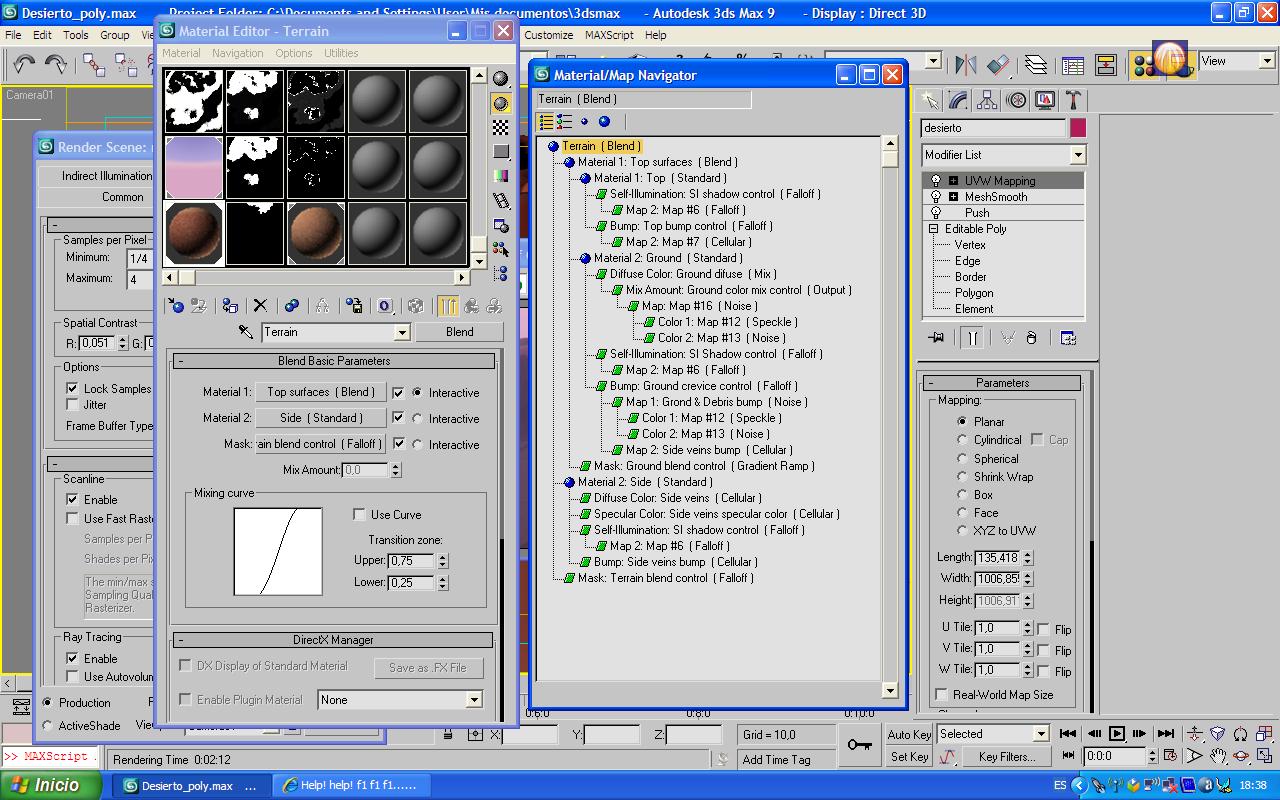 Un saludo a todos. Estoy realizando un tutorial de una revista sobre la creación de una escena desértica. En ella se utiliza una skylight y una Direct Light como iluminación, y Scanline como motor de render. En el terreno se aplica un material compuesto por muchos mapas (ver imagen) y un modificador UVW map alineado al eje y para las coordenadas de los lados del acantilado.